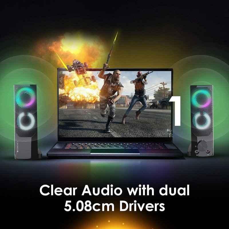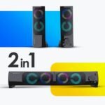 ZEB-Wonder Bar 10 is a 2.0 speaker that comes in a versatile 2-way design that can be set as one horizontal soundbar unit or as a vertical 2.0 speaker setup. The speaker has RGB lights and comes with support for USB/AUX and has headphone/mic port.