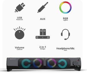ZEB-Wonder Bar 10 is a 2.0 speaker that comes in a versatile 2-way design that can be set as one horizontal soundbar unit or as a vertical 2.0 speaker setup. The speaker has RGB lights and comes with support for USB/AUX and has headphone/mic port.